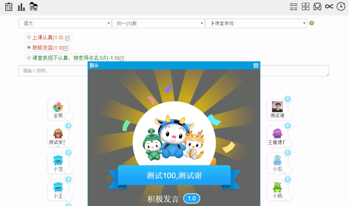 上课注意力不集中,课堂吵闹或没人回答问题,用“学科助手”课堂评价工具,活跃气氛,形成快乐有序的课堂